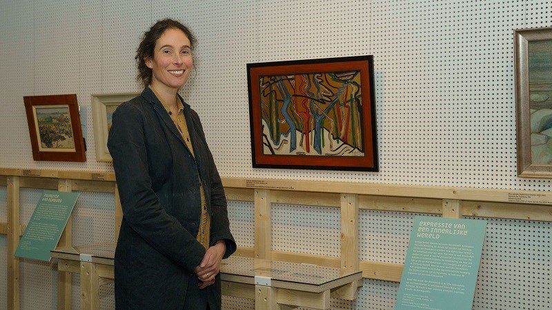 Zij is heel enthousiast over de tentoonstelling en reageert als volgt: ”Wat mij heel erg aanspreekt, is dat je een tijdreis maakt door de bijzondere kunstenaarsdorpen. Met mijn achtergrond als kunstenaar vind ik het leuk dat er meer is te zien dan alleen schilderijen. Het verleden wordt tastbaar door de voorwerpen die in de tentoonstelling te zien zijn. Daarnaast lijkt het door de ansichtkaarten alsof je door het schilderij heen kunt stappen en om je heen kunt kijken. Op deze manier zie je de wereld waarin het werk is gemaakt en waar de kunstenaar zich heeft begeven. Ik vind dat heel bijzonder om te ervaren.”