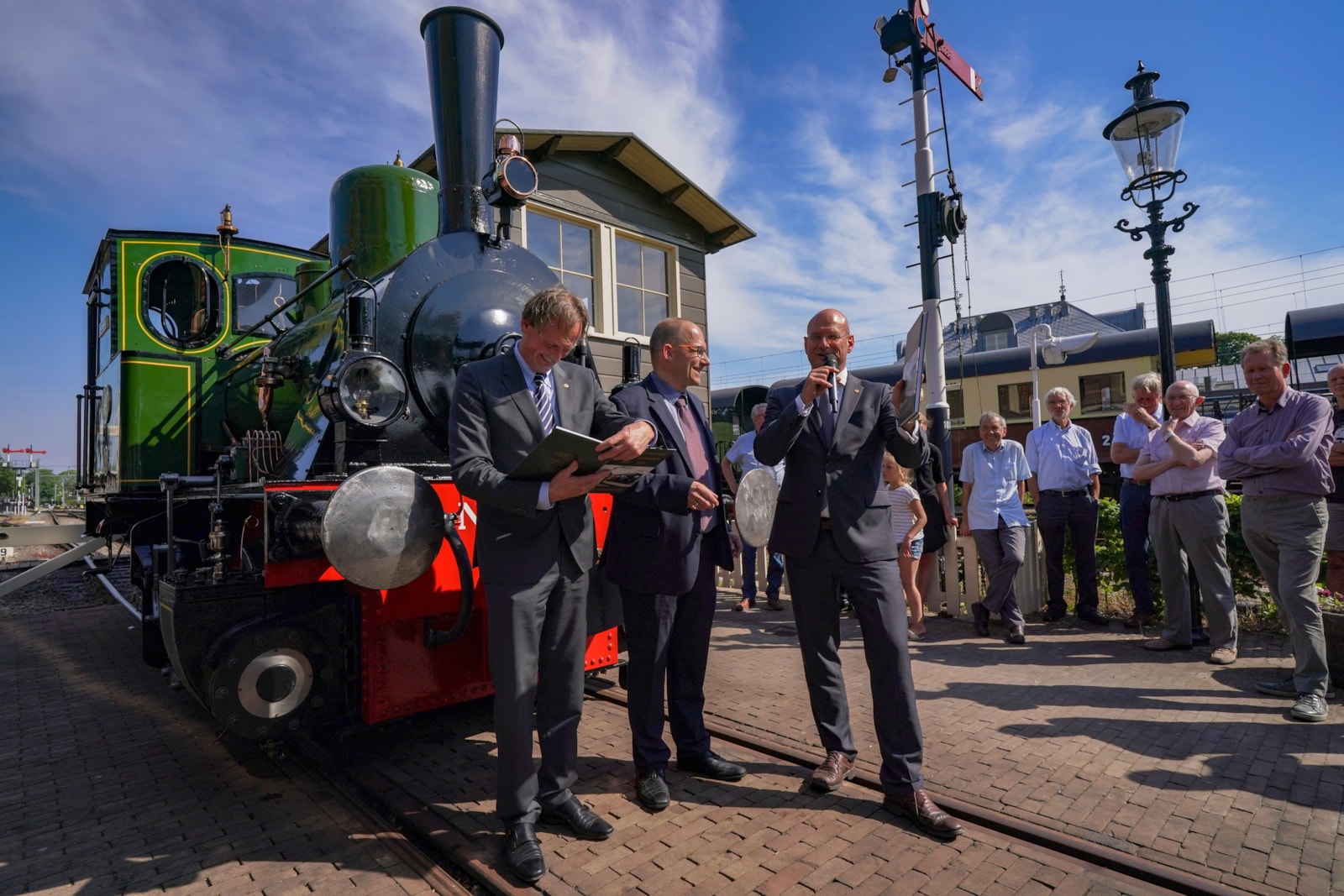 Beide burgemeesters en Hans de Herder ontvingen tenslotte de eerste exemplaren van het jubileumboek: Museumstoomtram Hoorn-Medemblik 1968-2018 - 50 jaar verbindend, uit handen van directeur René van den Broeke.
