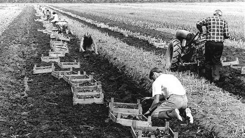Op je knieën kroop je dan door een goot in het land en raapte met je blote handen de bloembollen uit de met ’de Holder’ omgewoelde aarde. Zo’n Holder was een naar benzine en rook stinkende, door 1 persoon bediende ploeg die de grond schuin afsneed, waardoor de bollen aan de oppervlakte kwamen.