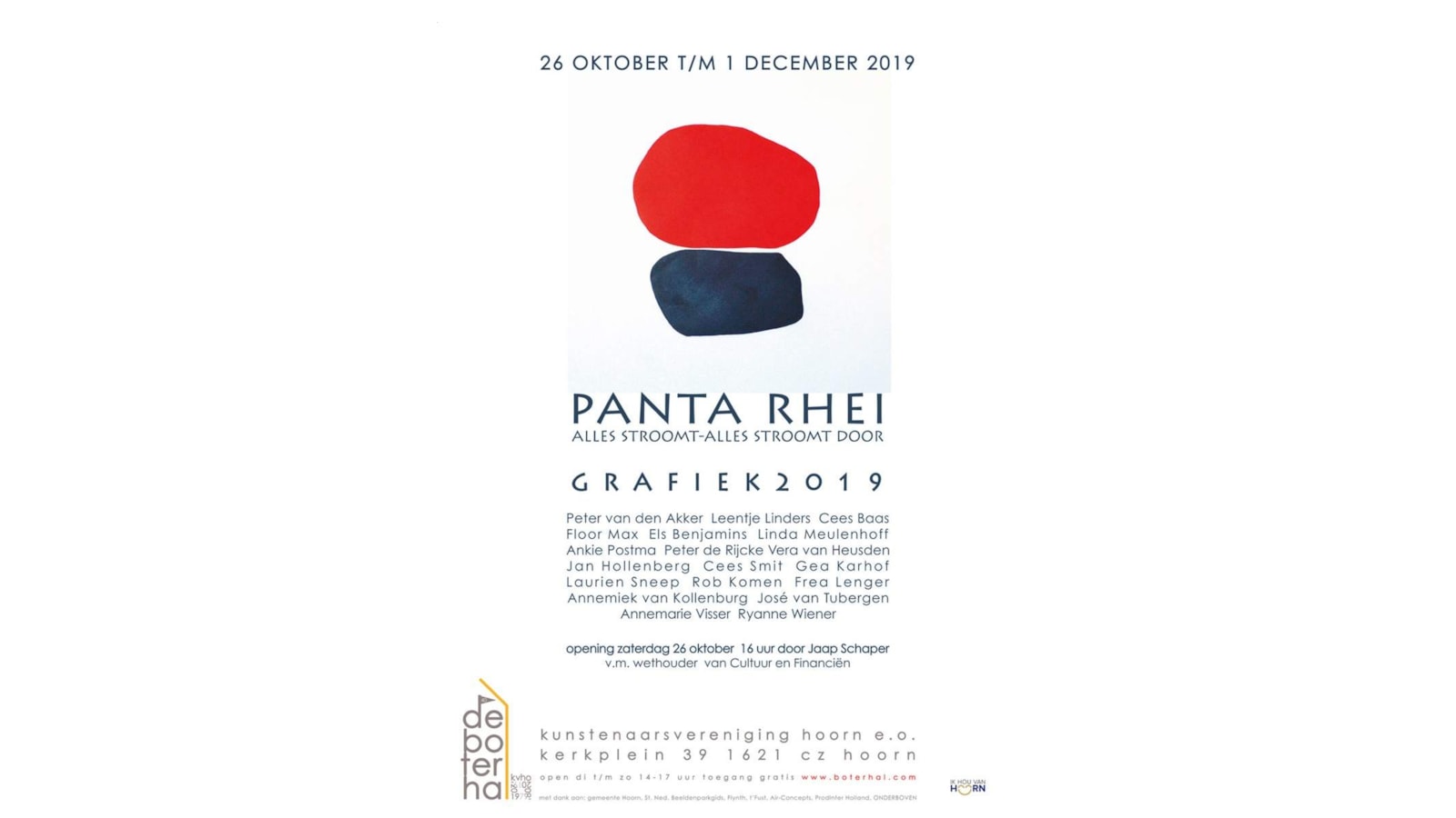 Panta Rhei – Alles stroomt – Alles stroomt door 19 grafici – 48 werken ets, lino, houtsnede, litho, zeefdruk is te zien in de Boterhal te Hoorn van: 26 oktober t/m 1 december 2019. Opening zaterdag 26 oktober, 16.00 uur door Jaap Schaper, ex-wethouder van Cultuur en Financiën van de Gemeente Hoorn.