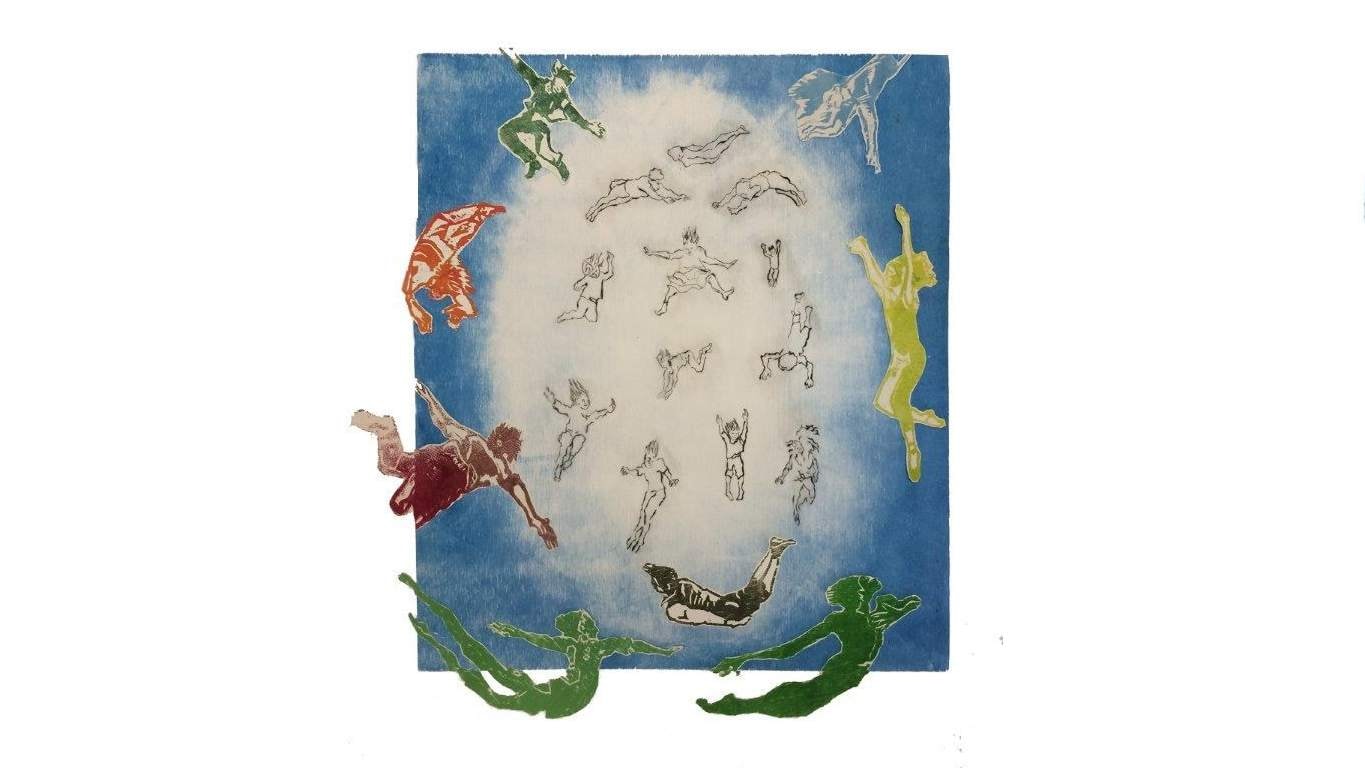 Foto: Els Benjamins, Vliegen vallen, 2019, houtdruk/droge naald, 70 x 90 cm