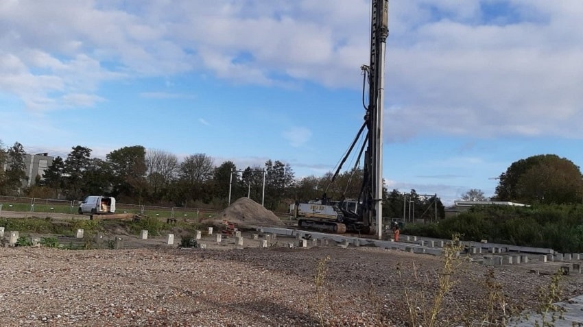 HOORNGIDS | In een tijdbestek van twee weken is de tweemansploeg van Boer Heiwerken er in geslaagd om voor de voorlopig laatste twee flats het heiwerk te voltooien.  Op de van hen bekende werkwijze ’niet kreunen maar dreunen’ hebben de onverstoorbare mannen de heipalen van 18 meter de grond ingewerkt, waarna een volgend team kan beginnen aan de voorbereidingen voor de fundering.