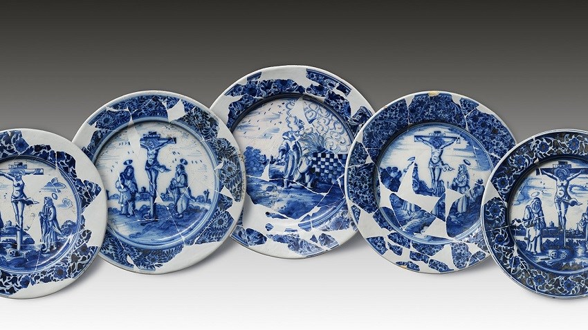 HOORNGIDS | De provincie Noord-Holland heeft vijf 17e eeuwse schotels laten restaureren. Vier schotels hebben een identieke beschildering van Christus aan het kruis. Archeologie West-Friesland vond de borden tijdens een onderzoek in Enkhuizen.