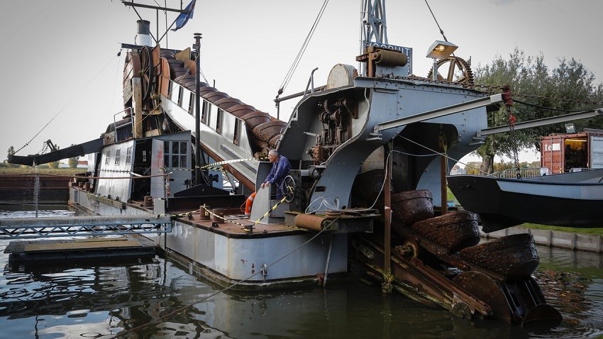 HOORNGIDS | De laatste kolengestookte emmerbaggermolen ‘Vooruit’, sinds 2005 één van de grootste attracties van het Nederlands Stoommachinemuseum in Medemblik, wordt donderdag 4 juni tussen 10 en 11 uur uit het water op de kant getakeld. Met steun van het Prins Bernhard Cultuurfonds, de Vereniging Stoomvrienden en de stichtingen Dioraphte en Zabawas werden voldoende fondsen bijeengebracht om de restauratie van deze enige nog op stoom werkende baggermolen in Nederland te voltooien.