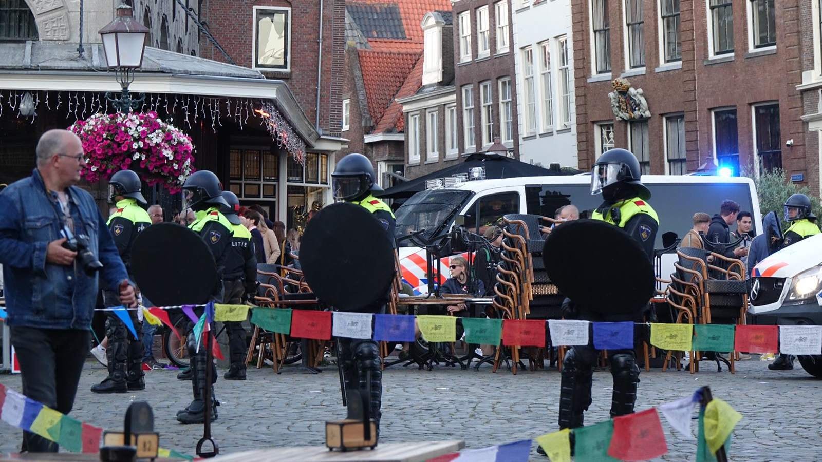 Agenten vormden een cordon rond het beeld. Terrastafels dichtbij het beeld gingen hardhandig aan de kant om ruimte voor het politiecordon te maken. De Roode Steen is daarna door de politie geheel ontruimd. Er zijn meerdere arrestaties verricht. Een van de arrestanten wegens (wild)plassen tegen de sokkel van het standbeeld.