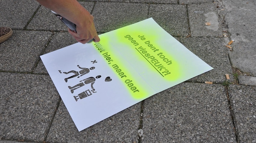 HOORNGIDS | Sinds kort kun je de leus ’Jij bent toch geen viespeuk!?’ zomaar tegenkomen op straat in de wijk Kersenboogerd. Het bewonersinitiatief ‘Schoon met een Sjabloon’ wil inwoners met opvallende uitingen op straat overtuigen om afval en peuken niet meer op straat te laten zwerven. Op vrijdag 25 juni heeft inwoonster Margreet Aartsen, die het initiatief bedacht heeft, de eerste uiting samen met Wethouder Samir Bashara geplaatst.