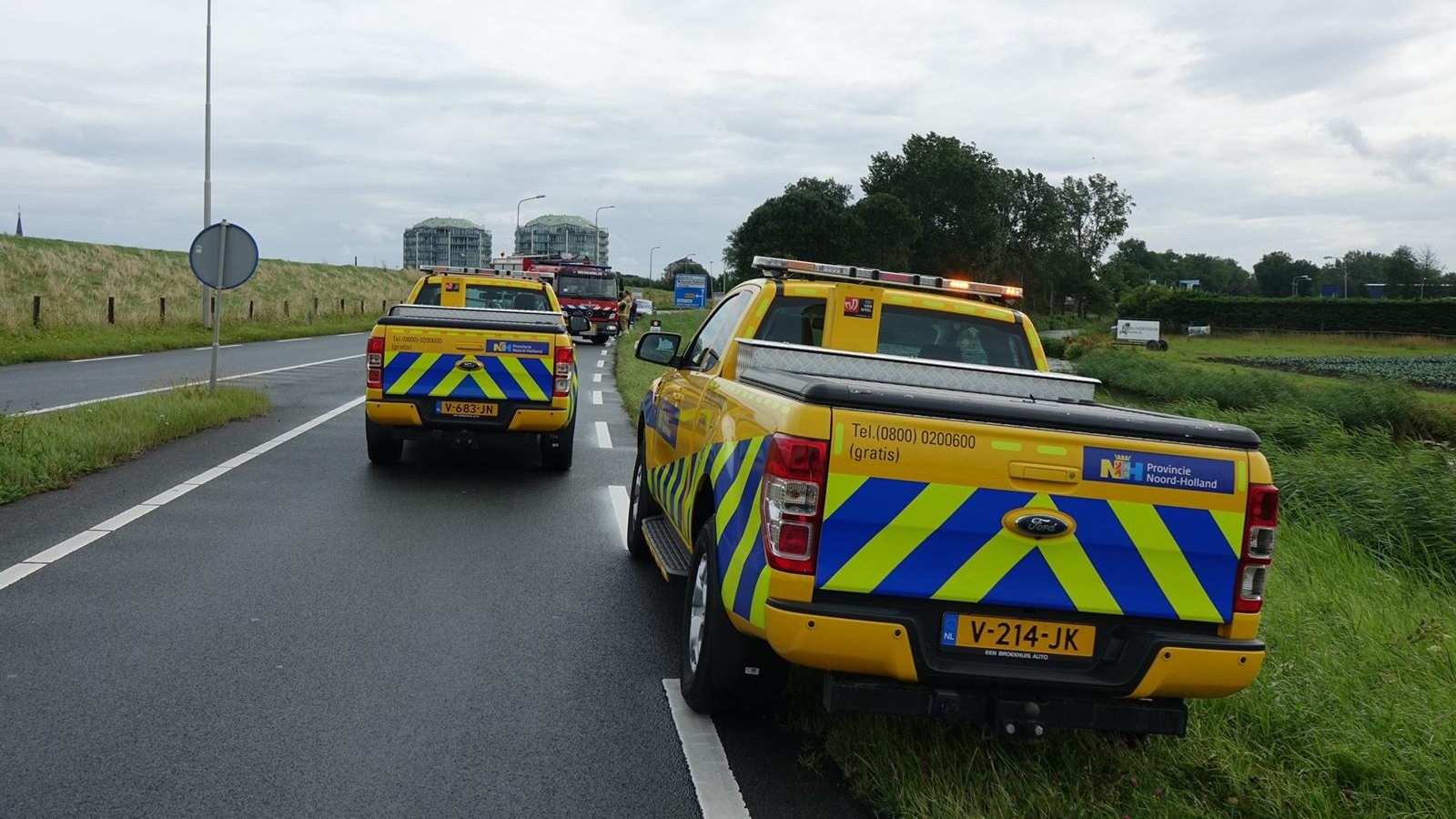 Een bergingsbedrijf vist de auto uit de sloot. De weg in de richting van Medemblik is afgezet.