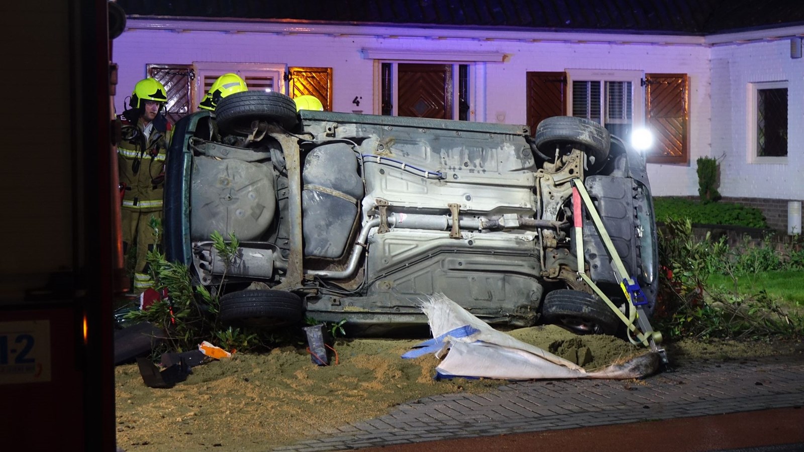 De auto kwam uit de richting Blokker toen deze van de weg raakte en op zijn zijkant tegen een puinzak vol zand tot stilstand kwam.