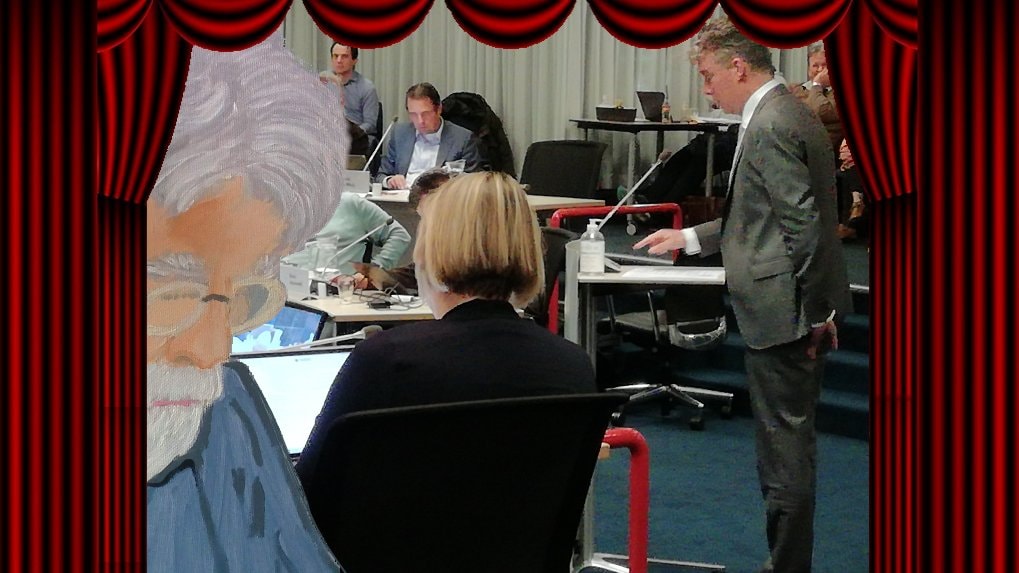 Uitleg over de gang van zaken werd uitgebreid uit de doeken gedaan door wethouder Simon, maar daarmee keerde de rust niet terug. Er heerste een duidelijke verdeeldheid tussen de fracties die de vragen hadden ingestuurd en, laten we zeggen, de rest van raad en college. De verbaasde toeschouwers mochten zien dat een meerderheid niet verder met de discussie wilde gaan dan de uitleg van de wethouder en het beantwoorden van alleen de gestelde vragen. Chris zat erbij en wilde een en ander weten en zocht tevergeefs kansen de zaak om te keren. Het gekrakeel ging door totdat burgemeester Jan op ferme wijze de discussie stopte, waardoor Chris niet de gelegenheid kreeg zijn laatste scene uit te spelen en te zorgen voor een cliffhanger, zodat men de vervolgaflevering niet zou willen missen.