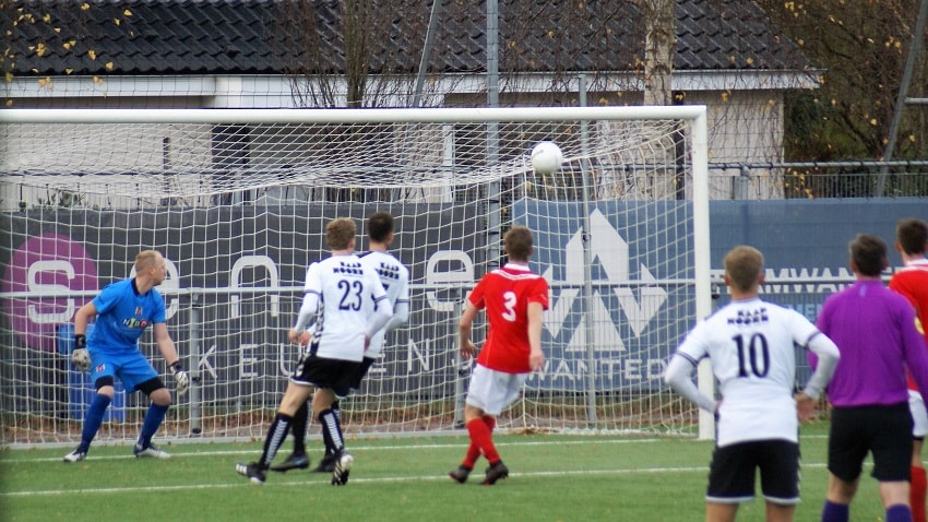Het eerste doelpunt van Valken in de 15e minuut was wel een hele mooie. De bal werd bij een hoekschop vanaf links teruggespeeld op de volkomen vrijstaande Huig van Duijn en deze mocht de bal van ver over de verraste Dirk Bakker in de rechterbovenhoek deponeren. Stand 1-0.