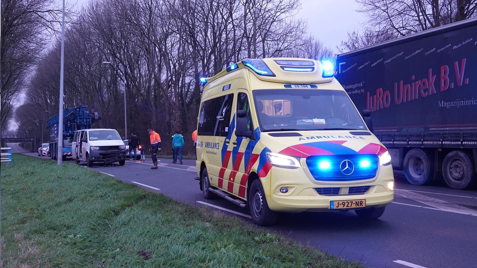 Een personenauto wou inhalen via het verdrijfvlak en kwam bij die manoeuvre frontaal in botsing met een tegemoetkomend busje. Door de terugstoot van de klap reed de de personenauto achteruit, en kwam daarbij tegen de achteropkomende auto tot stilstand. Een persoon is in de ambulance naar het ziekenhuis vervoerd.