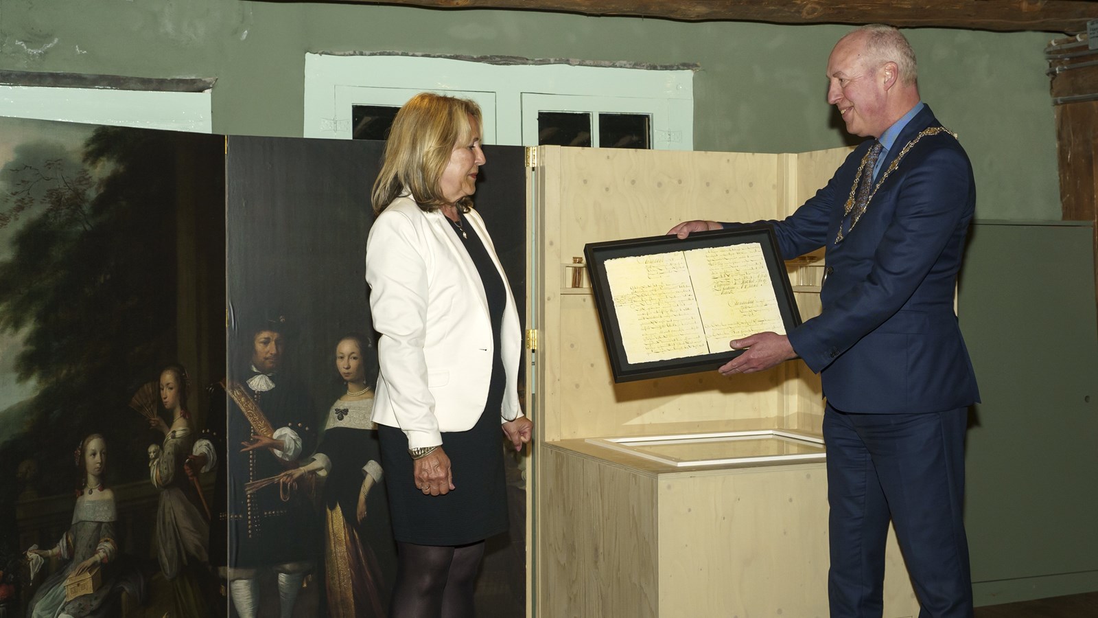 Foto 1: Burgemeester Eduard van Zuijlen neemt aankoopbewijs van Cornelis Valentijn in ontvangst van Jeannette Baas, één van de nazaten van Cornelis Valentijn, foto Studio Merike.