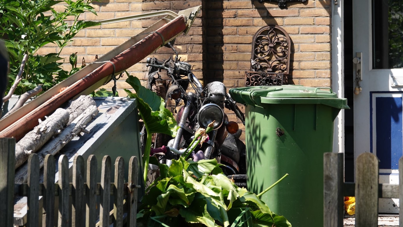 De oude motorfiets stond tegen het huis geparkeerd. De brand was snel onder controle. Er zijn vier katten uit de woning gehaald. Een hoogwerker kwam ter plekke om de situatie te controleren.