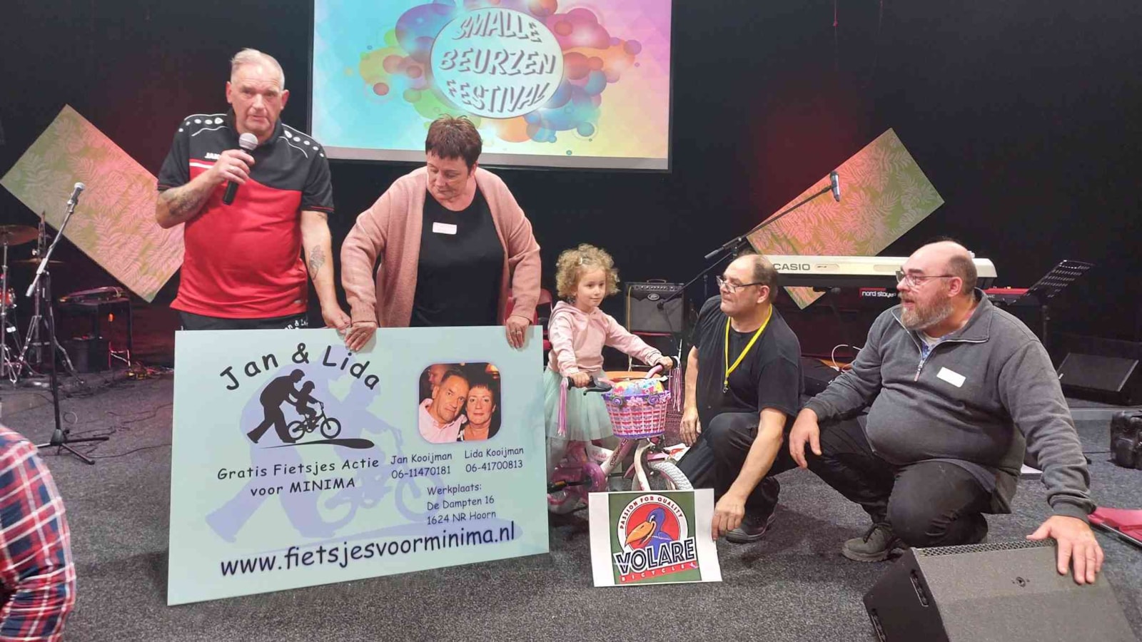 Op de Give Away markt kon je gratis spulletjes en kleding shoppen bij AyudaMe. Ook Jan en Lida waren aanwezig met gratis kinderfietsjes van hun stichting ’Gratis Fietsjes Actie Voor Minima’. Zij hebben op het Smalle Beurzen Festival maar liefst 54 fietsen weggegeven! Daarvan waren 32 vooraf aangemeld, de overige 22 werden tijdens het Festival spontaan bij de kraam aangevraagd. Er werden ook twee fietsen verloot. ”Wat waren ze blij”, aldus Jan Kooijman. De meisjesfiets was voor Nathalie uit Medemblik, opgegeven door Kim Janssen Duijghuijsen en de andere was voor Lennox. Deze jongen kwam uit Enkhuizen en was opgegeven door de Familie Henk Waanders uit Medemblik, schrijft Jan Kooijman op zijn Facebookpagina. Ook bedankt hij daar Edwin Boelsz, Lisette Boelsz en Tom Kwakman van Volare Bicycles uit Volendam die twee NIEUWE fietsjes hebben geschonken. Verder bedankt hij het hele team van ’Gratis Fietsjes Actie Voor Minima’: Ralf, Johan, Jack, Frank, Carola, Krista en Pascal. ”Het was GRANDIOOS”. Zie de foto.