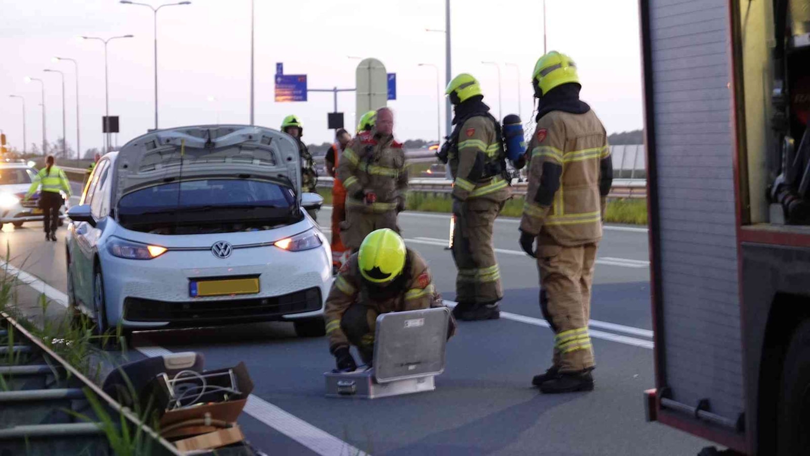 Vlakbij de afrit stopte de automobilist, omdat het accupakket begon te smeulen. De brandweer kwam snel ter plaatse en schakelde de dompelbak in. Dat is een grote container met water waarin de elektrische auto wordt ondergedompeld. De auto moet daarin enkele dagen blijven, om deze definitief veilig te kunnen verklaren.
