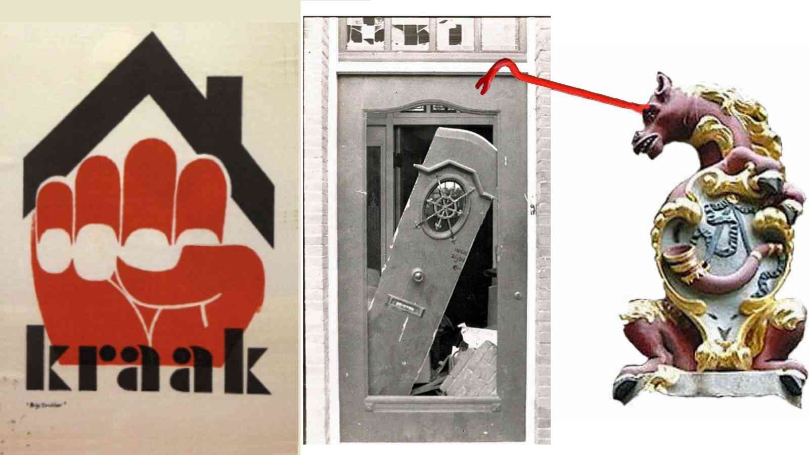 Foto’s aangeleverd: Logo’s kraakbeweging/ingebeukte deur Pastorie in Zwaag en Christiaan Heydenrijk destijds vooraanstaand lid van de kraakbeweging
